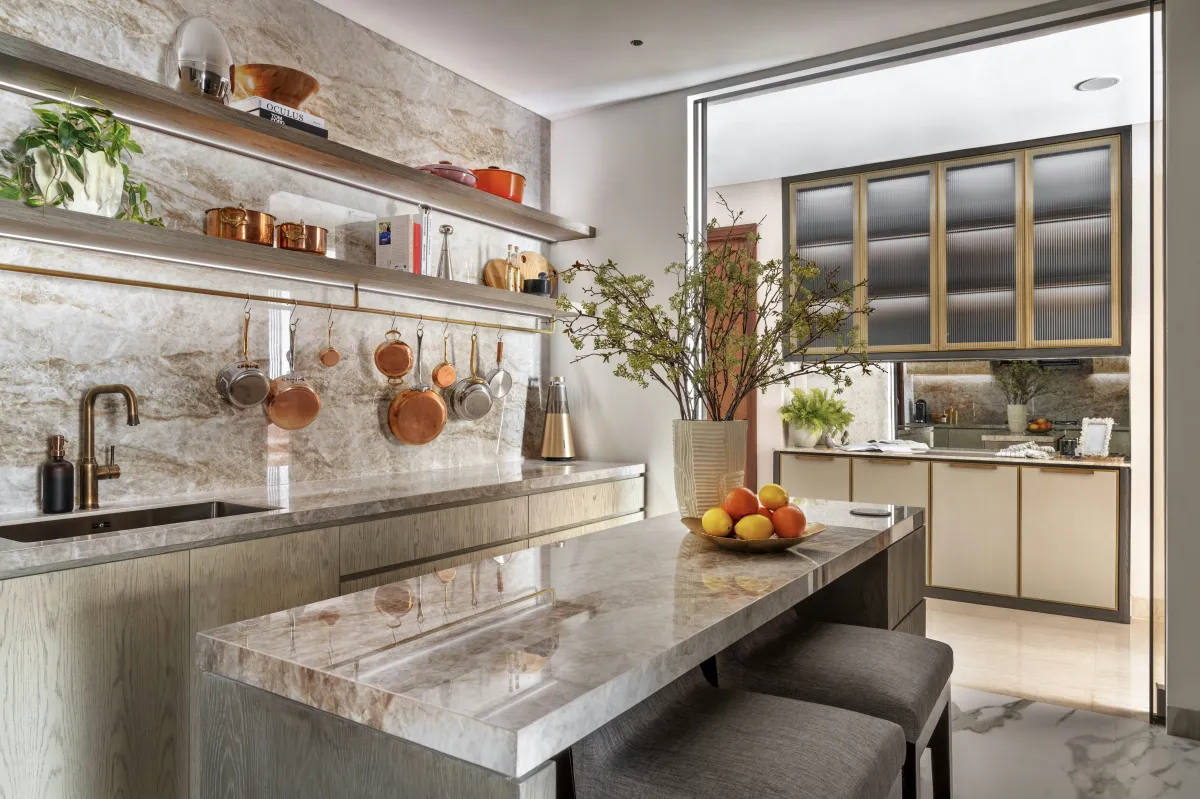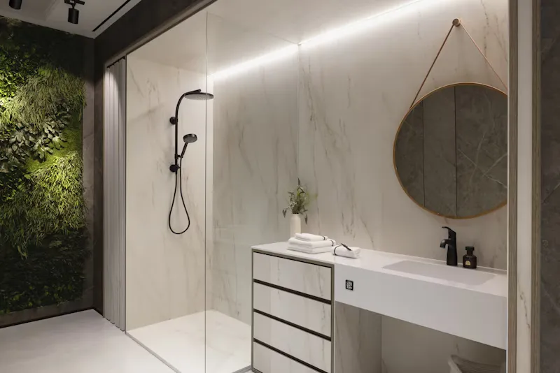 Sleek Design: Continuous seamless slabs for walls and floors.
